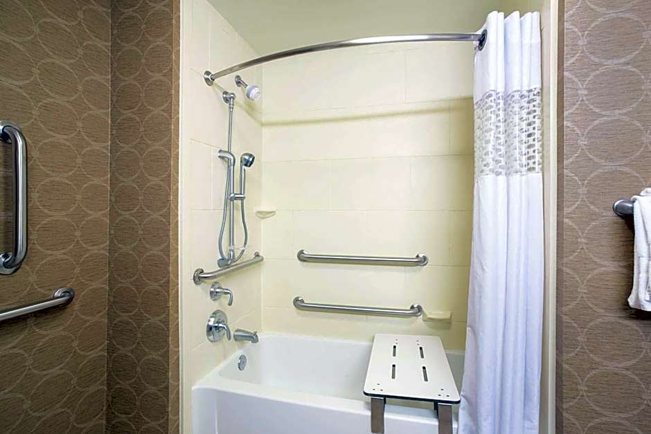 A cable TV is featured in this room. A large tub with grab handles is installed in this accessible room. Visual alarms and notification systems are included.